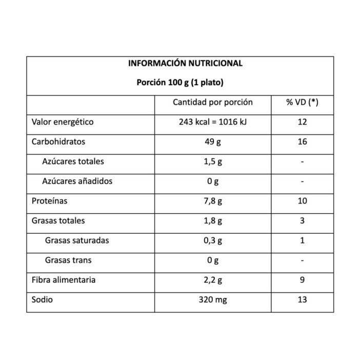 Valores Diarios con base a una dieta de 2.000 kcal u 8.400 kJ. Sus valores diarios pueden ser mayores o menores dependiendo de sus necesidades
